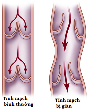 Ở một tĩnh mạch khỏe mạnh bình thường, các van đóng lại để ngăn máu ngược trở lại. Ở một tĩnh mạch bị giãn các van này mất chức năng không cho dòng máu chảy ngược hoàn toàn. |