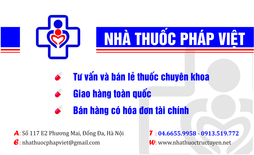 NHÀ THUỐC PHÁP-VIỆTĐịa chỉ: Số 117-E2, Phố Phương Mai, Phường Phương Mai, Quận Đống Đa, TP Hà Nội Điện thoại: 024.66.55.9958 - 0834.55.9958 E-mail: nhathuocphapviet@gmail.com Skype: nhathuocphapviet Zalo: Nhà Thuốc Pháp Việt |