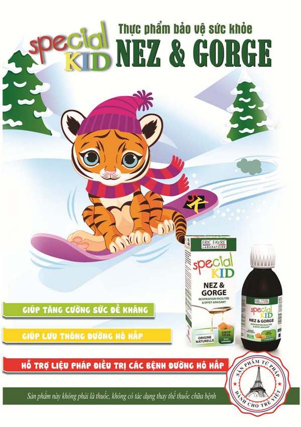 Sản phẩm Special Kid Nez & Gorge (Giúp giảm ho và thông thoáng đường hô hấp) là sản phẩm thực phẩm bảo vệ sức khỏe mang thương hiệu Special Kid của Tập đoàn Eric Favre từ Pháp. Thương hiệu nhận chịu trách nhiệm về chất lượng sản phẩm: Công ty TNHH Thương Mại và Dược Phẩm Việt, địa chỉ: số 5B, Ngõ 2, Phương Mai, Đống Đa, Hà Nội.